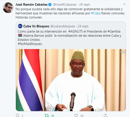 In their interventions before the UNGA, the African leaders, including the Gambian, Adama Barrow, called for the normalization of the ties between Washington and Havana to promote friendly relations between the States, and others such as the South African, Cyril Ramaphosa, reiterated the demand to definitive end to the blockade of Cuba.