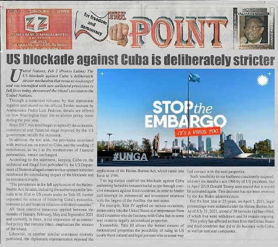 United Nations, Feb 2 (Prensa Latina) The US blockade against Cuba is deliberately stricter mechanism that remains unchanged and was intensified with new unilateral provisions in full force today, denounced the island’s mission to the United Nations.