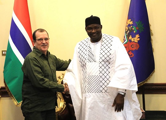 Banjul, Feb 10th.- The President of The Gambia, Adama Barrow, conveyed fraternal greetings to his Cuban counterpart, Miguel Díaz-Canel, today, in a meeting to say Good bye to the outgoing ambassador of the Caribbean island in this West African nation, Rubén G. Abelenda.