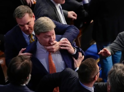 Rep. Richard Hudson (left) pulls Rep. Mike Rogers back as they talk with Rep. Matt Gaetz and others during the 14th round of voting for speaker as the House meets for the fourth day to try and elect a speaker and convene the 118th Congress in Washington, January 6, 2023. /Getty